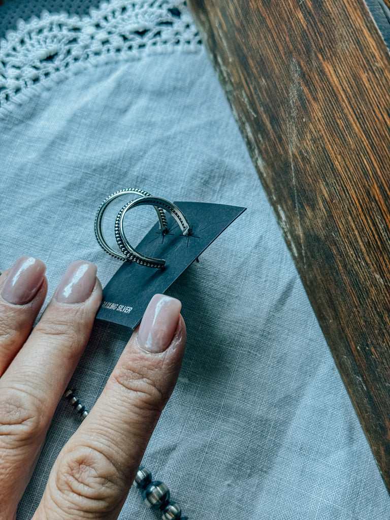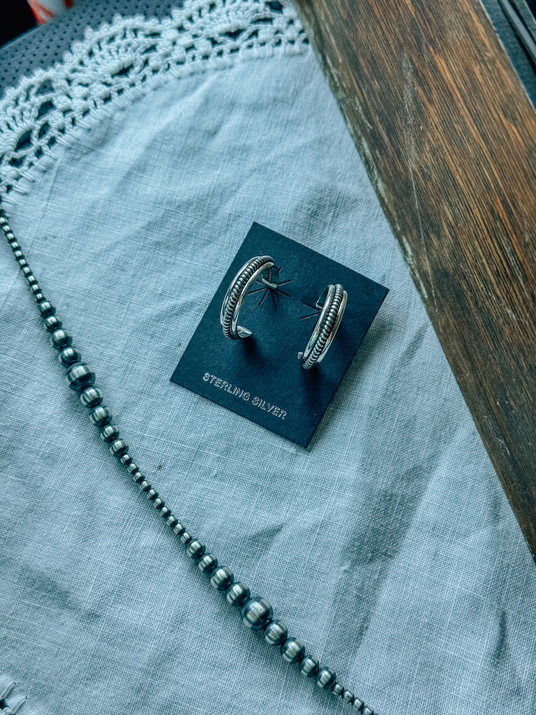 Sterling silver hoops handmade by Caroline Tsosie. About 1” in diameter.