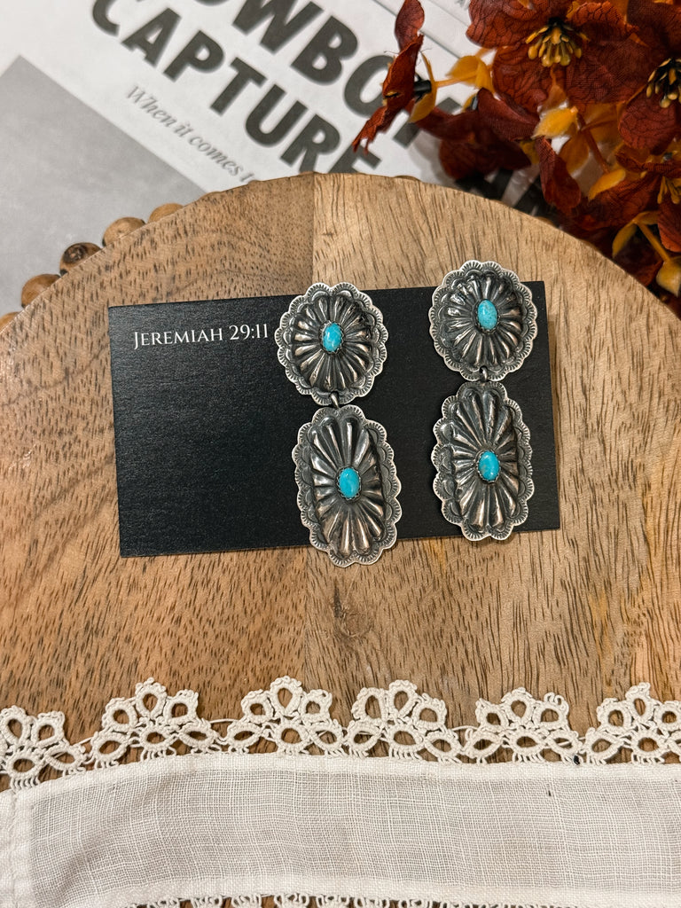 These sterling silver and authentic turquoise earrings are made by Yolanda Christian. They measure 2 1/4”