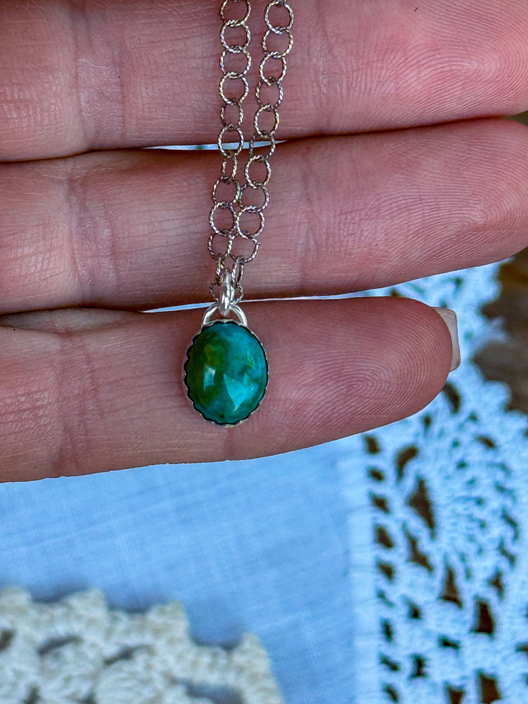 This beautiful Kingman stone is 8x10mm set in silver and on an 18” sterling silver chain. Handmade by me.