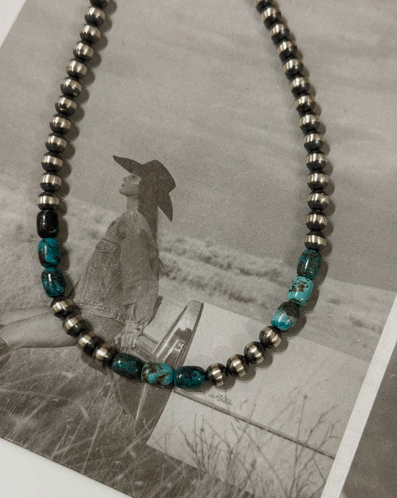 16” 6mm Sterling silver machine made pearls with authentic turquoise accents. Comes with a shepards hook clasp.