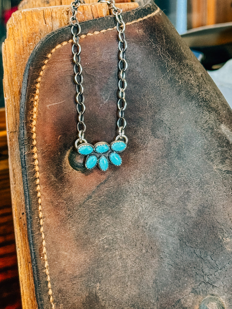 Handmade by me using Sterling silver and Kingman turquoise. 16” sterling silver chain.