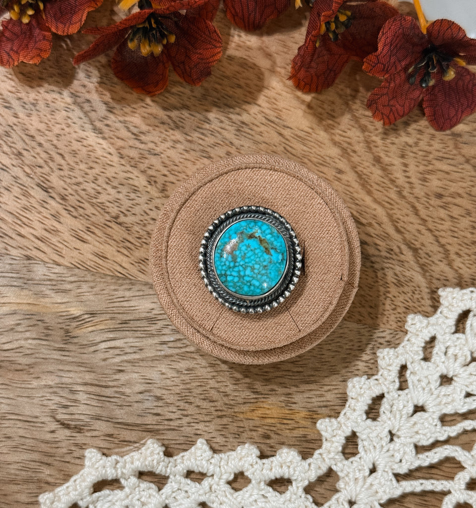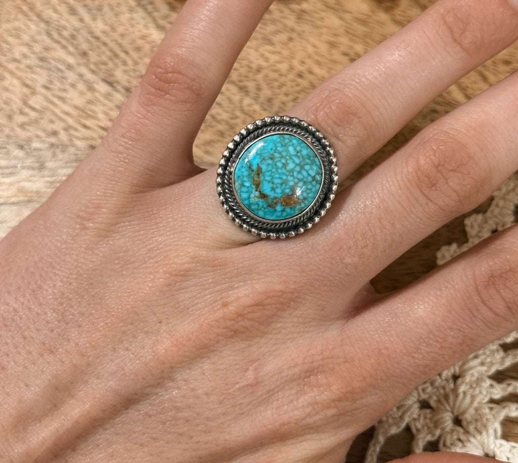 This super cool ring is made by Marie Tsosie and is sterling silver with Kingman turquoise. Signed and stamped.