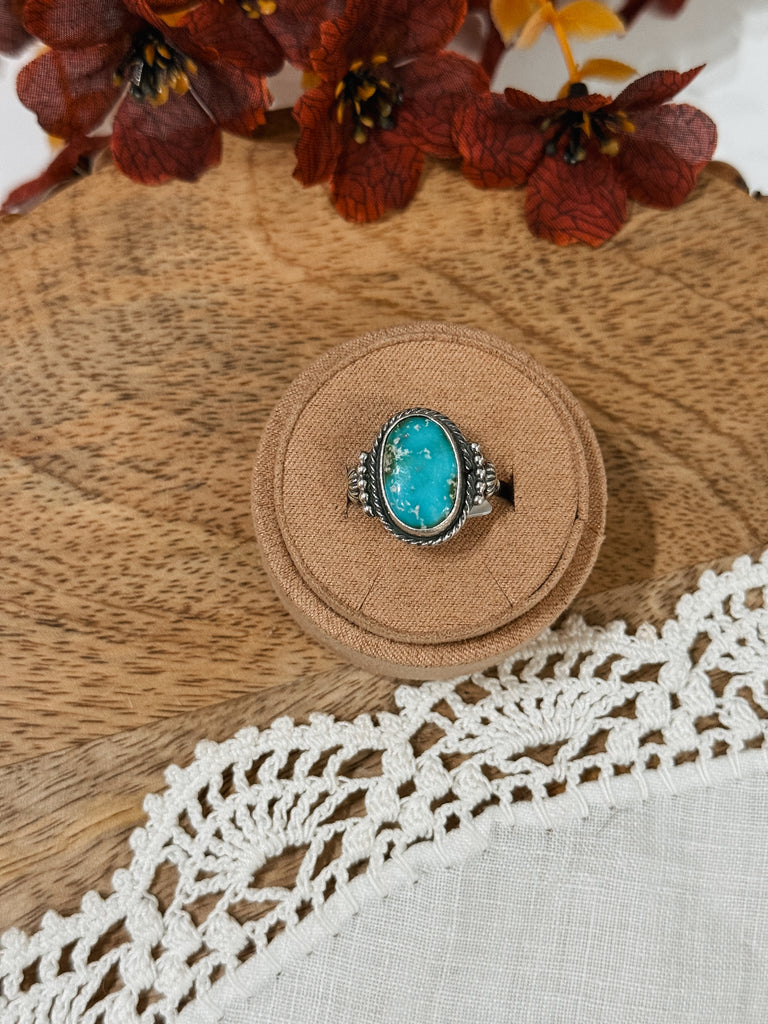 This ring is a size 9 and made by Sam Yellowhair. Sterling silver and Sonoran gold turquoise.