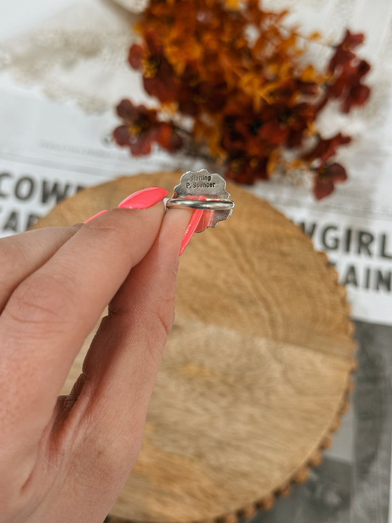 Red coral & Sterling silver size 5.5. Stamped Sterling & by artist, P. Spencer.